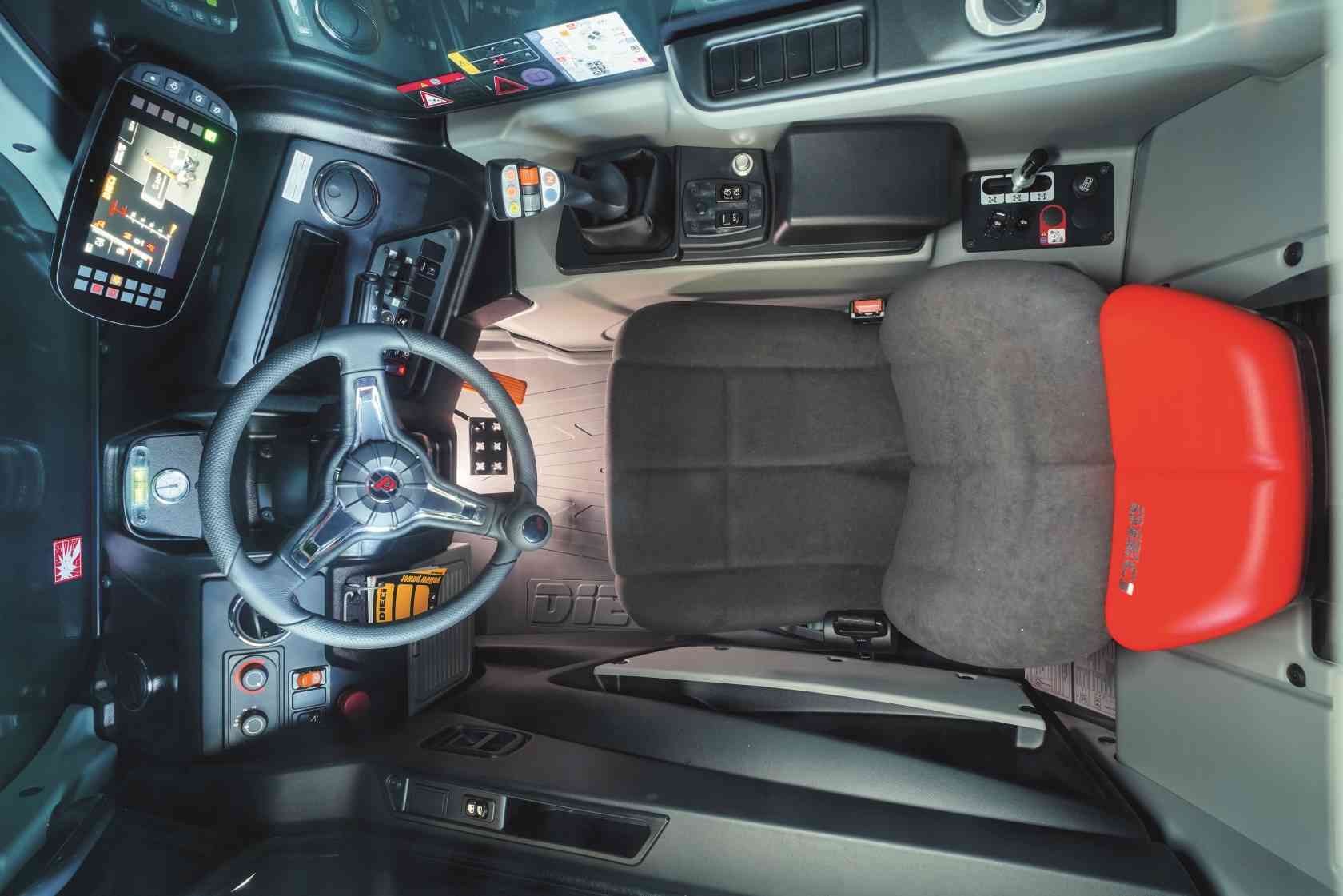 - Cabina con elegantes interiores soft-touch, asiento calefactable con 3 sistema de suspensión, más espacio para las piernas del operador, columna de dirección y apoyabrazos regulables, techo, salpicadero y moqueta insonorizantes.