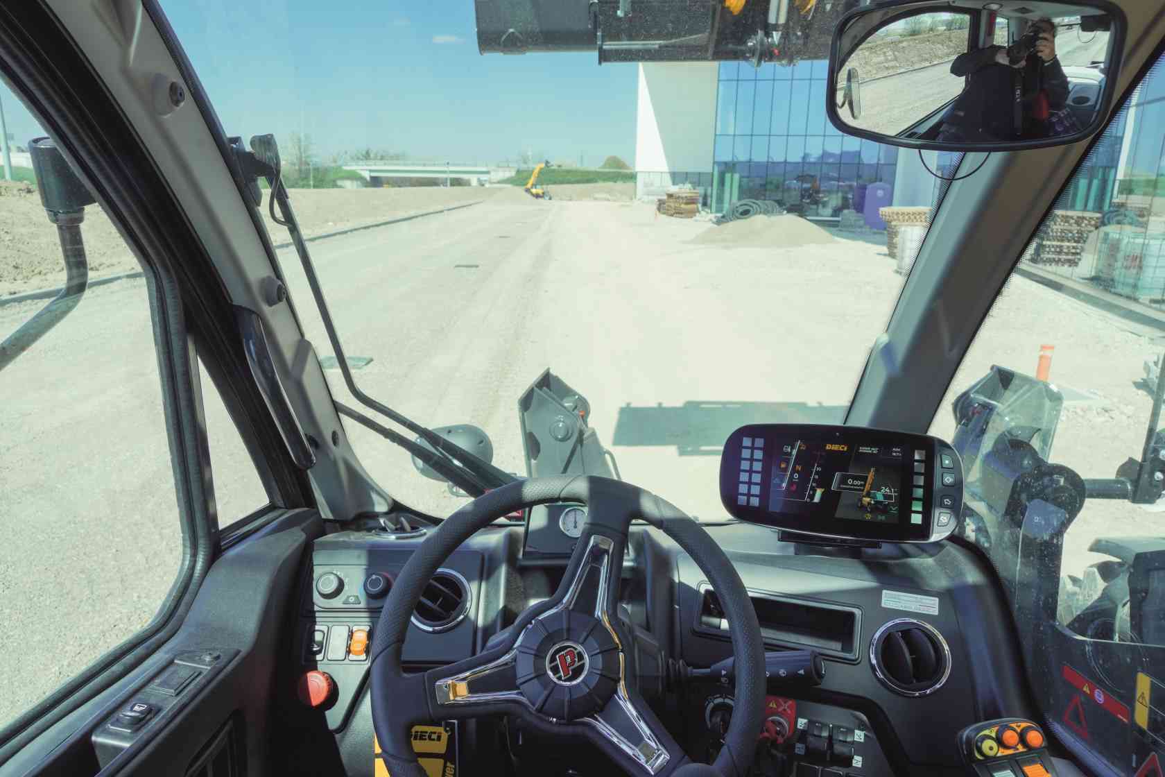 - Visibilidad elevada gracias a su amplia superficie acristalada, luces de trabajo de led en la cabina, perímetro y brazo, espejos retrovisores orientables y tres cámaras sin cable.
